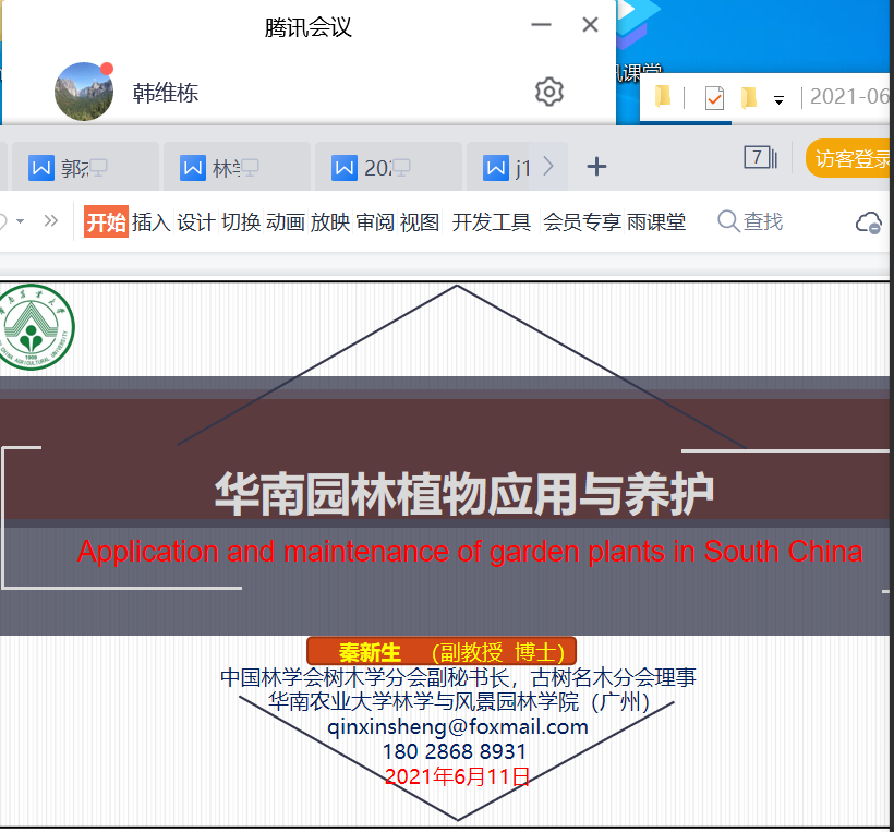 风景园林学科邀请,6月12日上午,中国林学会树木学分会副秘书长、中国林学会古树名木分会理事、华南农业大学林学专业主任秦新生博士、副教授,通过腾讯会议为我校师生作《华南园林植物应用与养护》专题线上学术报告,报告由涩里番