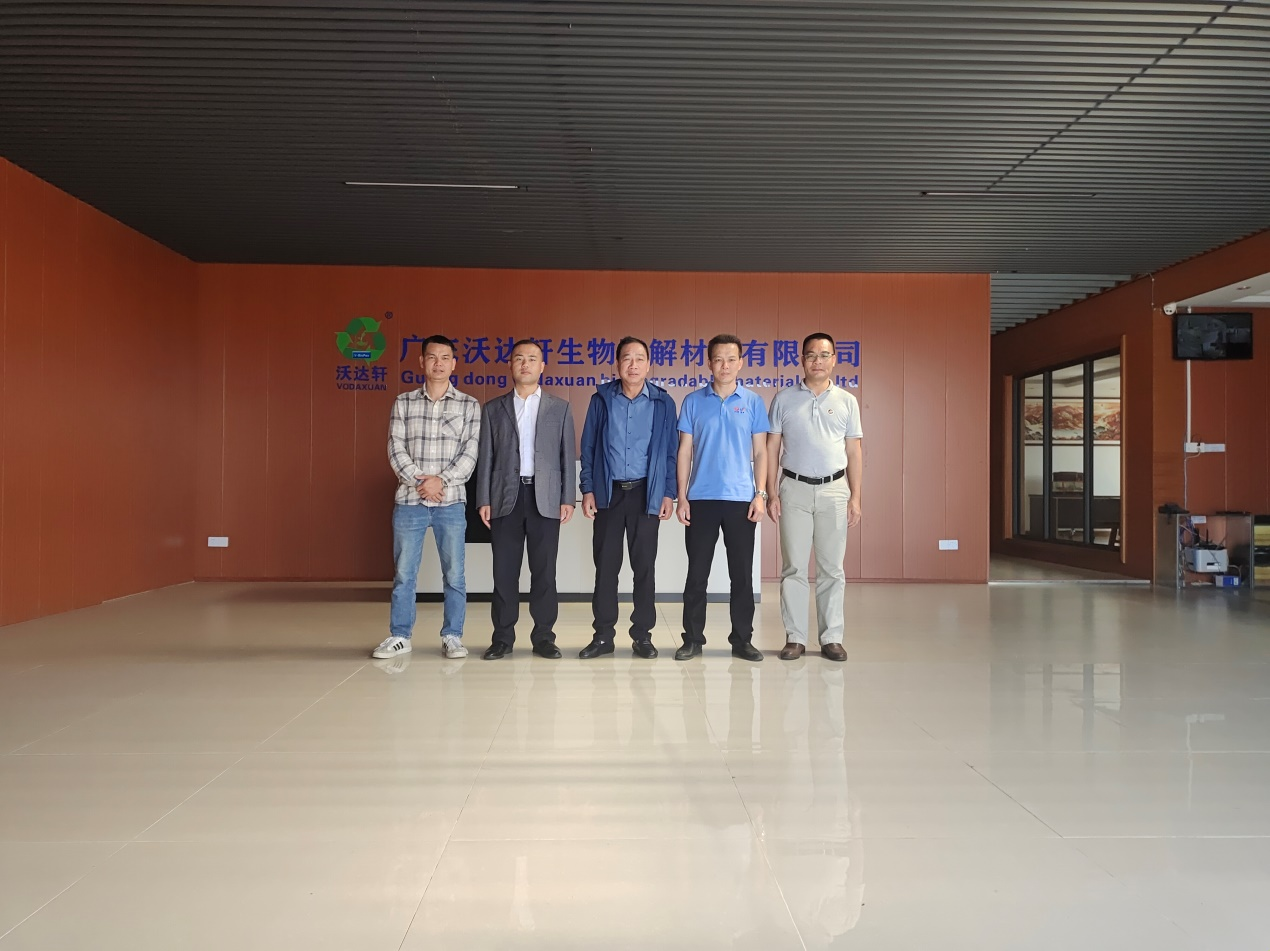 由于水稻秸秆焚烧污染大,秸秆还田降解慢,集中存放占空间,因此开发一种低碳环保可降解的材料很有必要。在这一思路指引下,大家畅所欲言。随后前往广东沃达轩生物降解材料有限公司,董事长谢总带领大家参观了公司的办公场所和生产车间,详细向大家介绍了国家未来双碳发展目标、公司的生物降解理念以及农业污染与可再生材料生产衔接。双方就水稻秸秆、木薯块、甘蔗糖渣以及菠萝皮等开发生物可降解材料探讨合作。