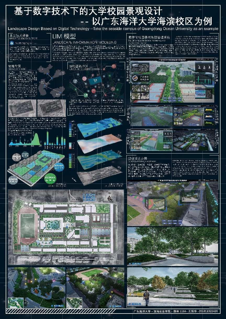 海滨校区为例”荣获本科生组优秀学子奖。该作品利用ArcGIS CityEngine数字平台探索真实场地景观虚拟仿真构建、使用UE4引擎搭建数字化景观监控管理系统、实现实时动态模拟和数据信息联动展示、基于监测数据进行景观设计,实现数字孪生技术与景观设计营造的创新融合。该作品将代表我校园林专业在2022广东风景园林教育大会中展出。