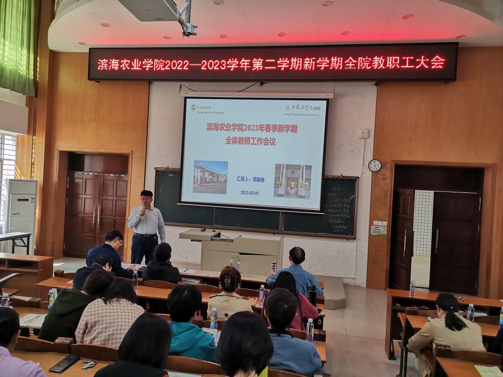 在兴农楼109室召开新学期全院教职工大会。会议由学院党委副书记陈嘉文主持。