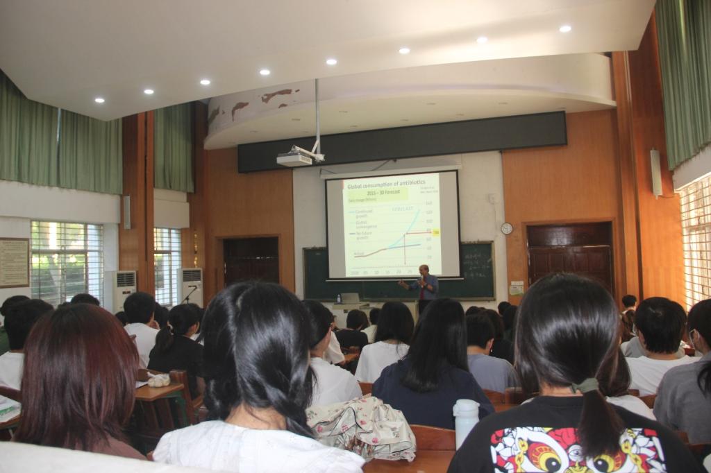 师生作学术报告。Ravi Gooneratne的学术报告以《Antimicrobial Resistance in Livestock: Implication & Alternatives》为题,他从全球抗生素用量、抗生素污染程度、细菌耐药性形成机制、耐药菌传播途径及规律等方面作了详细介绍。Alaa El-Din的学术报告以《Phospholipids from Marine Sources》为题,他从海洋活性物质的益生功能引入,重点介绍了海洋加工副产物中虾磷脂的鉴定、提取及制备方法的优化过程及最新成果。动物医学系和动物科学系部分青年教师、研究生及“卓越班”学生约150参加会议,报告会由动物医学系主任巨向红教授主持,涩里番