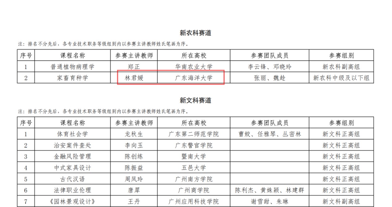 全国高校教师教学创新大赛是高级别的教学竞赛,被誉为教学奥林匹克大赛。本届广东省分赛参赛教师(团队)数量创历史新高,全省74所高校603支教师团队围绕8大赛道展开激烈角逐,仅前30%的队伍可入围决赛并获奖。林君媛教学团队聚焦新农科建设进行教学创新设计,通过课程内容重构、教学方法创新、教学环境创设、教学评价改革等途径,构建“四育”闭环式教学创新模式,获得了评委的肯定。